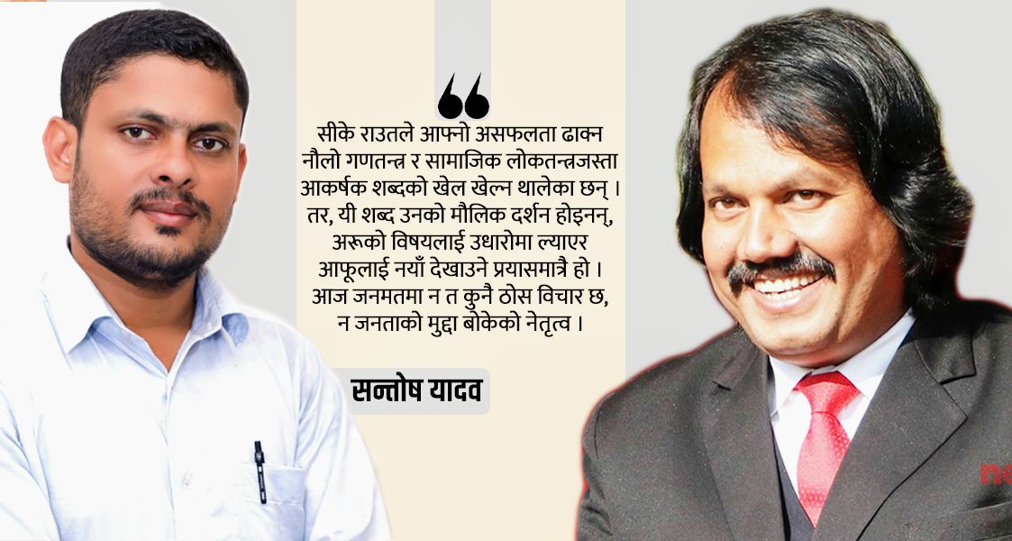 सन्तोष यादव पछिल्लो समय जनमत पार्टीका अध्यक्ष डा. सिके राउत नेपाली राजनीतिमा हाँसो, विष्मय र आक्रोशको पात्र बन्दै गएका छन्...