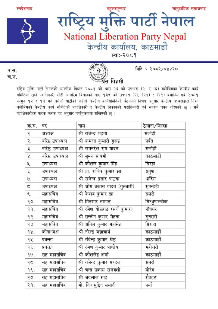 राष्ट्रिय मुक्ति पार्टीको पदाधिकारी र सदस्य चयन : अध्यक्ष १, वरिष्ठ उपाध्यक्ष ३ र महासचिव ५ जना (सूचीसहित)