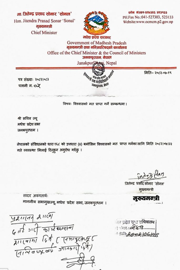 जनकपुरधाम । मधेश प्रदेशका मुख्यमन्त्री जितेन्द्र प्रसाद सोनलले विश्वासको मत लिने प्रक्रिया सुरु गरेका छन् । उनले आगामी कार्तिक २२ गते प्रदेशसभाबाट विश्वासको मत लिने तयारी गर्दै प्रदेशसभा सचिवालयमा पत्र पठाएका छन् ।